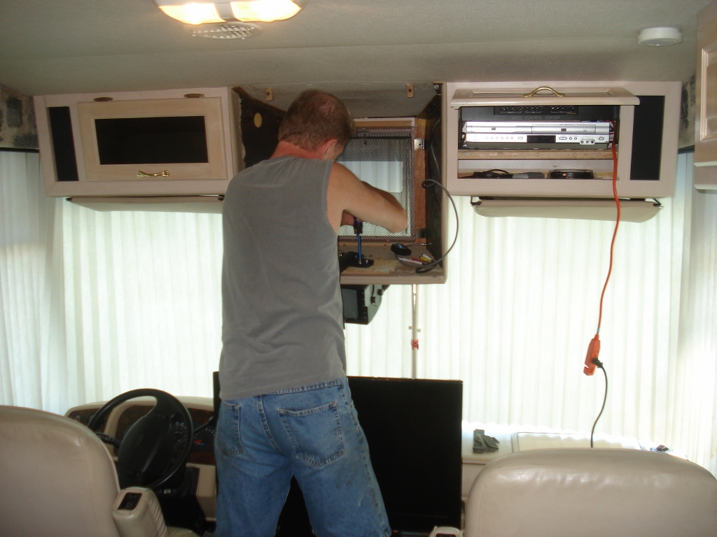 I've been wanting to put a new 32 inch flat panel TV in the mo-ho. I hated the big old 27 inch one we had that was up next to the ceiling. I wanted one more at a comfortable viewing angle. So, we finally decided to do it.